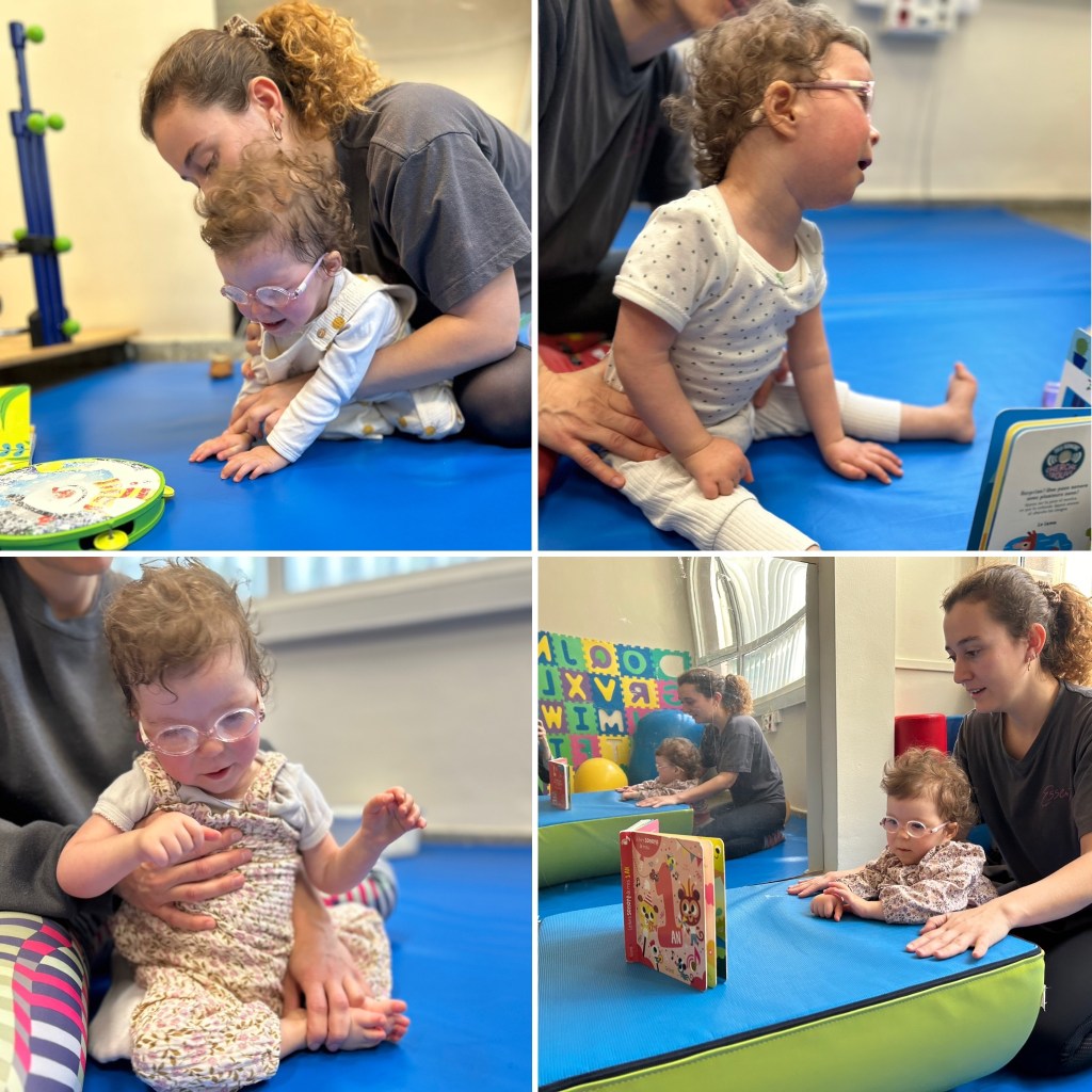 - 1 heure de kinésithérapie au sol axée sur le travail des réflexes pour la position assise (équilibre, appuis des mains sur le sol, posture, tonus).