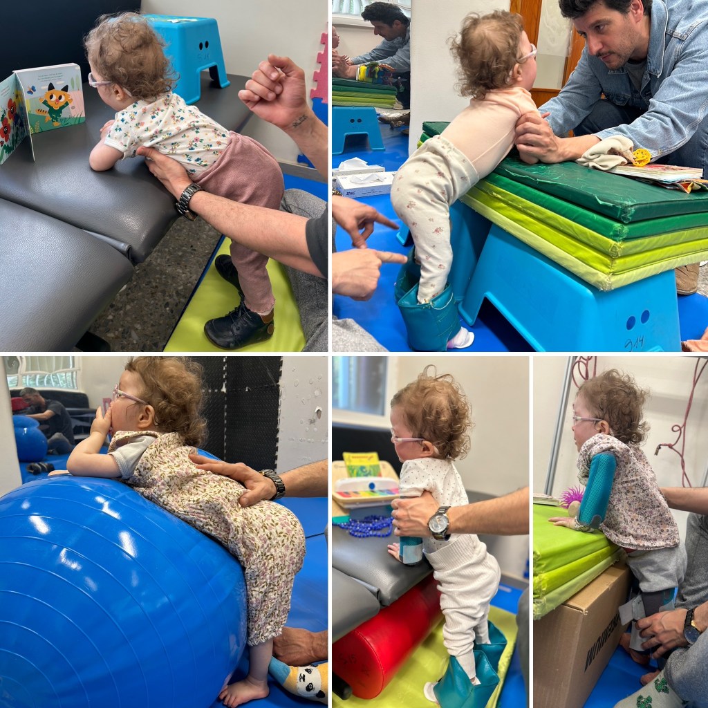 - 1 heure de kinésithérapie dédiée à un travail en position debout pour intégrer les jambes dans son schéma corporel, et notamment l’action de pousser sur ses membres inférieurs.