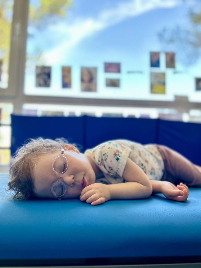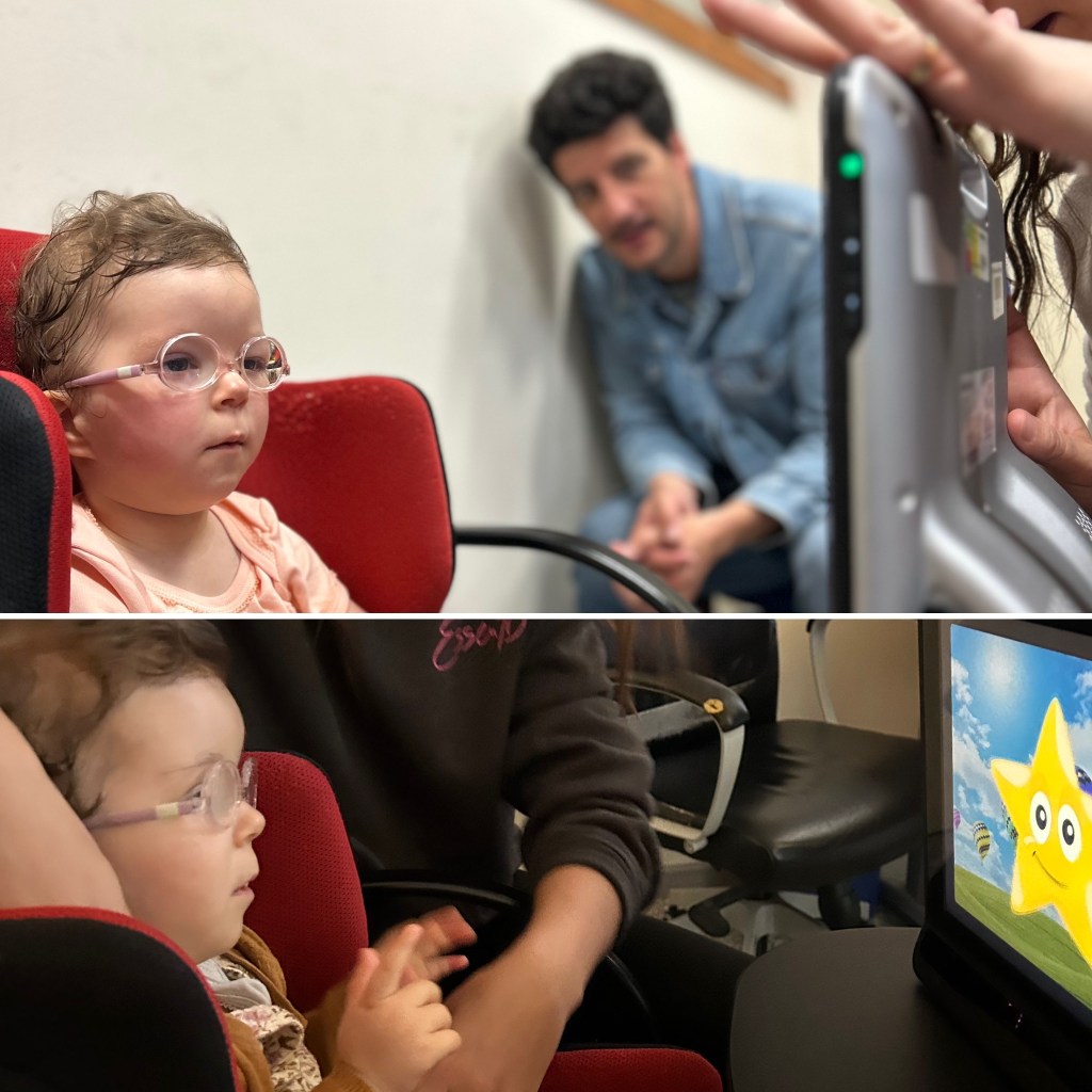 - 1/2 heure d’orthophonie pour stimuler les muscles de la bouche avec l’outil vibratoire Z Vibe, et travailler la fixation et l’attention visuelle à l’aide d’une tablette à commande oculaire.